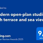 Modern Open-Plan Studio With Terrace And Sea View Daire dairesinde 1 yatak odası vardır. Modern Open-Plan Studio With Terrace And Sea View Daire dairesi ayrı tuvalet, duş ile donatılmış 1 banyo odası sağlamaktadır.